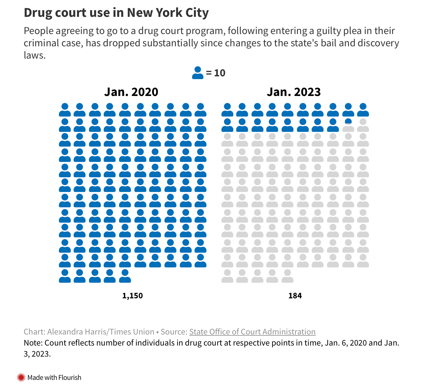 In the category of unintended consequences, drug court participation in New York has dropped nearly 50% since the 2019 bail reform laws. It turns out that bail reform may lead fewer people to request admission or be willing to accept admission to these courts.